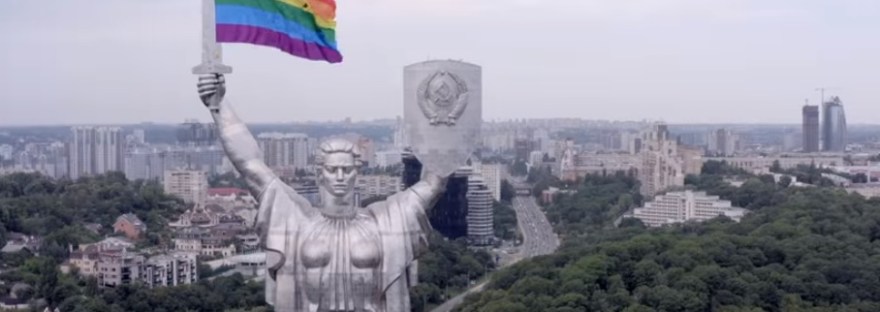 On June 21, 2020, a Ukrainian NGO KyivPride, that for several years already has been the main organizer of the Pride week and Equality march in Kyiv, posted a video in which a drone carrying a large rainbow flag flew over various districts of the Ukrainian capital. The flag ended up placed on top of the Motherland Monument, a Soviet-era war memorial in Kyiv. The monument is a large steel statue of a symbolic mother holding a sword and shield. The drone flew in front of the sword so that on the video, it looked as if the mother was waving a flag.